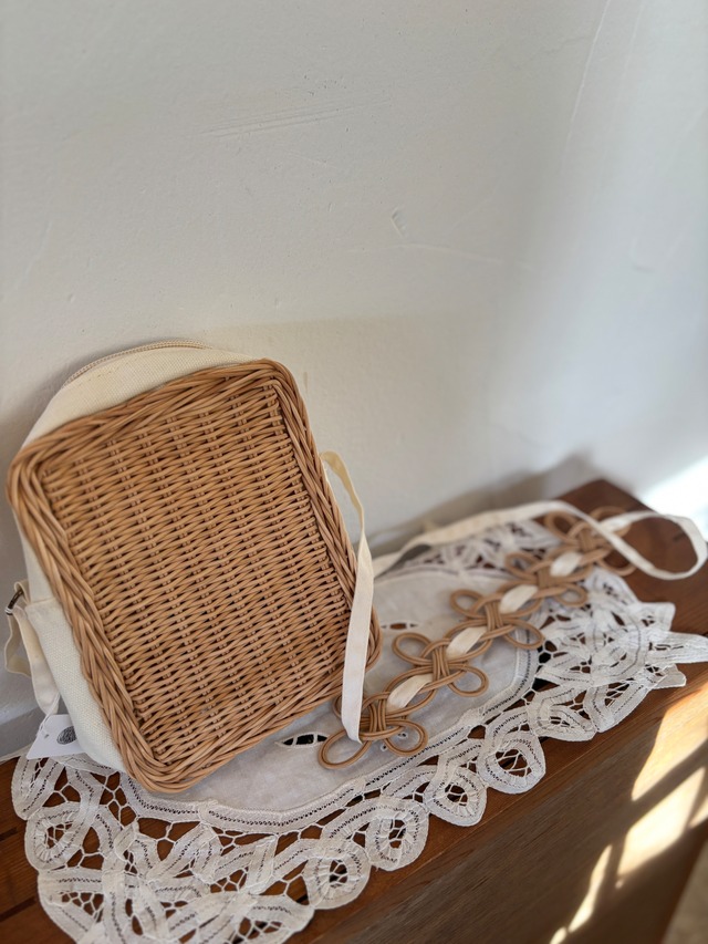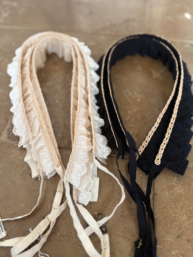 ③コットン生地のプリーツとコットンレース・チュールレースを合わせたフリルの中央に 籐編みを合わせたショルダーストラップです。 アジャスターで長さ調節が可能です。 フリル部分は約80cm 全体で約120cm〜130cmになります。 価格 5,800円