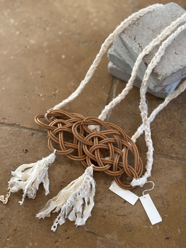籐あみのモチーフに裂き布とアンティークレースのタッセルをつけたペンダントです。 裂き布をかぎ針で編んだ紐を後ろで結ぶタイプです。 ※1今回の販売は枚目のタッセルが付きます。 価格4,800円