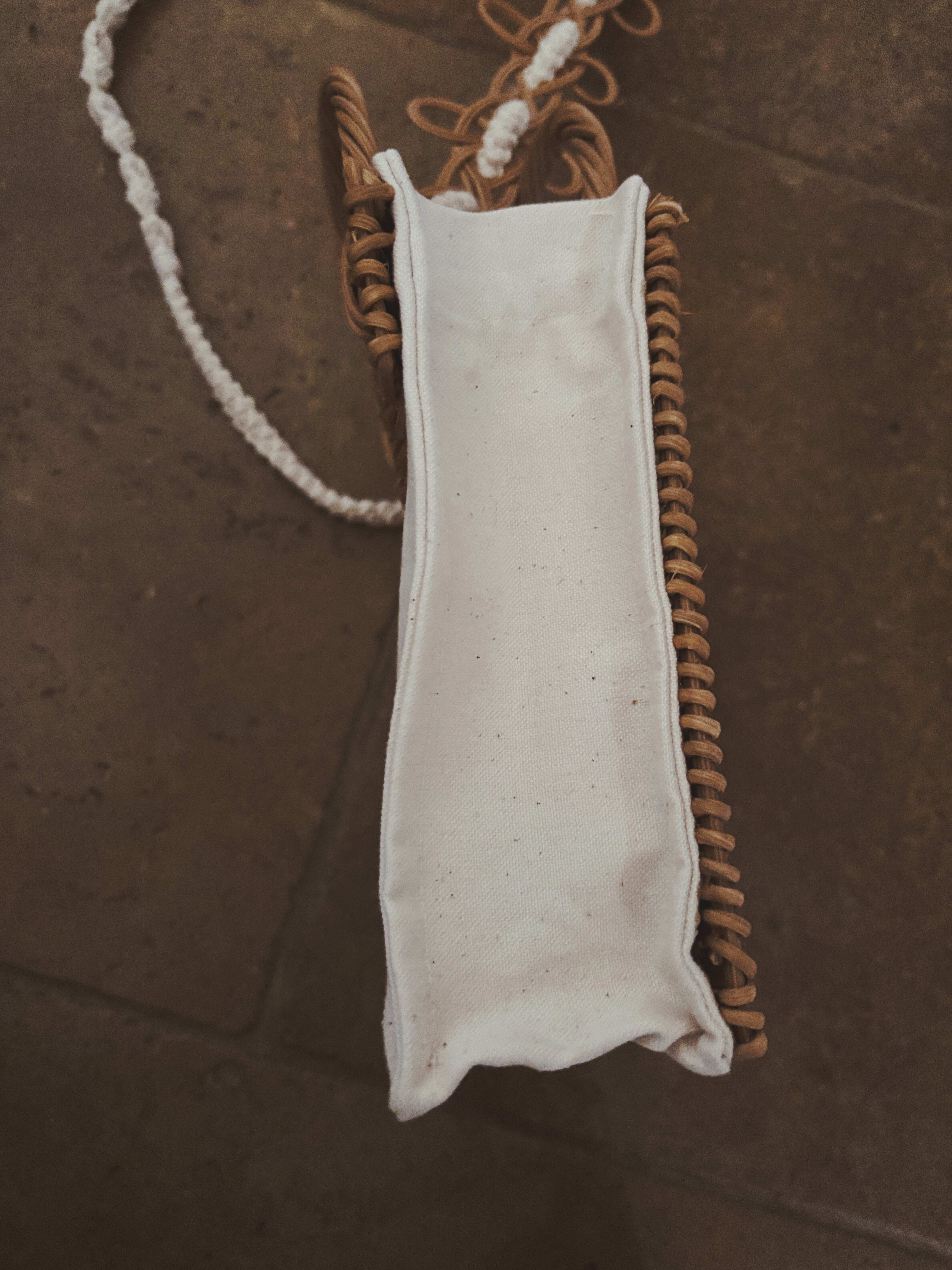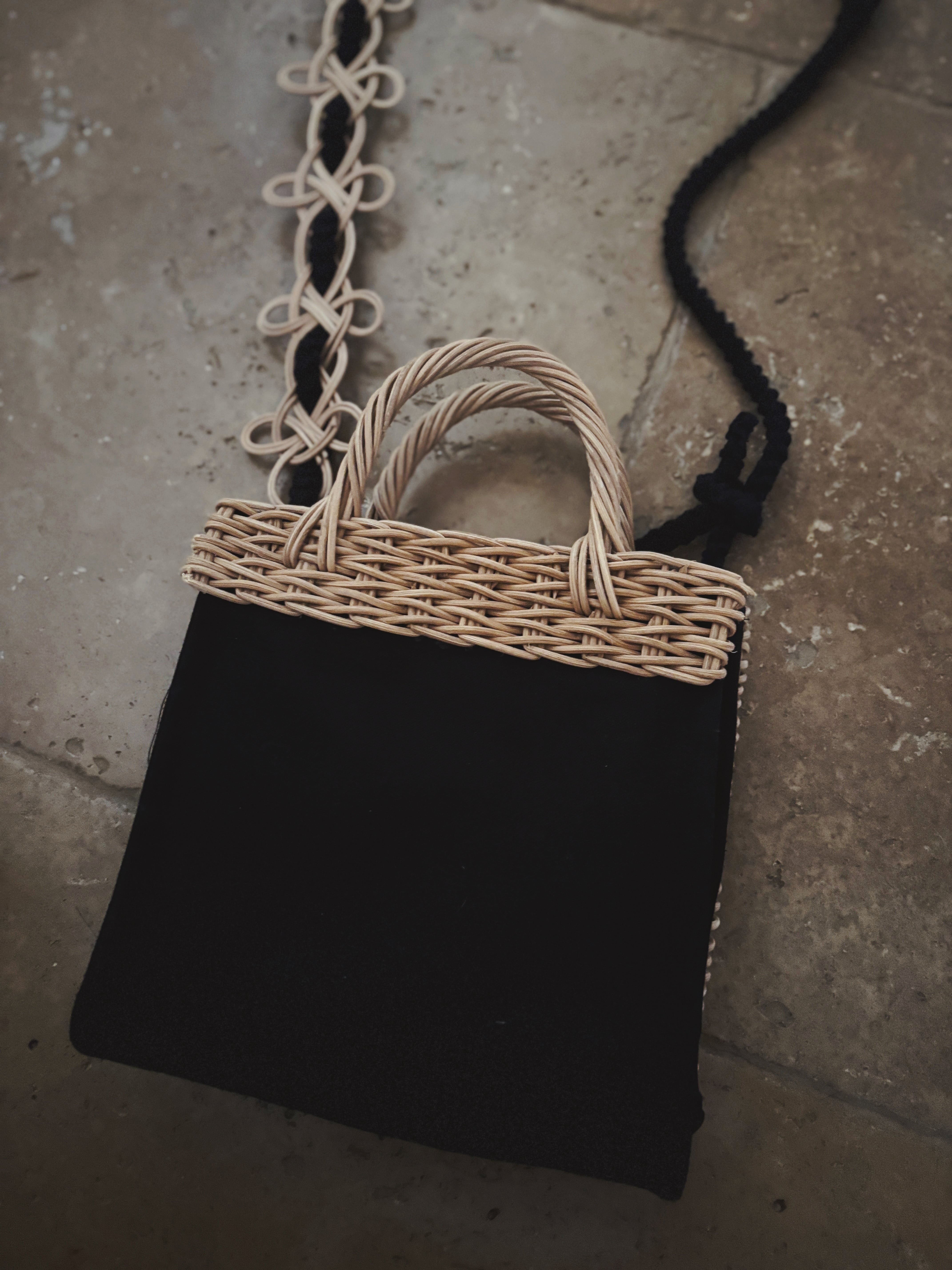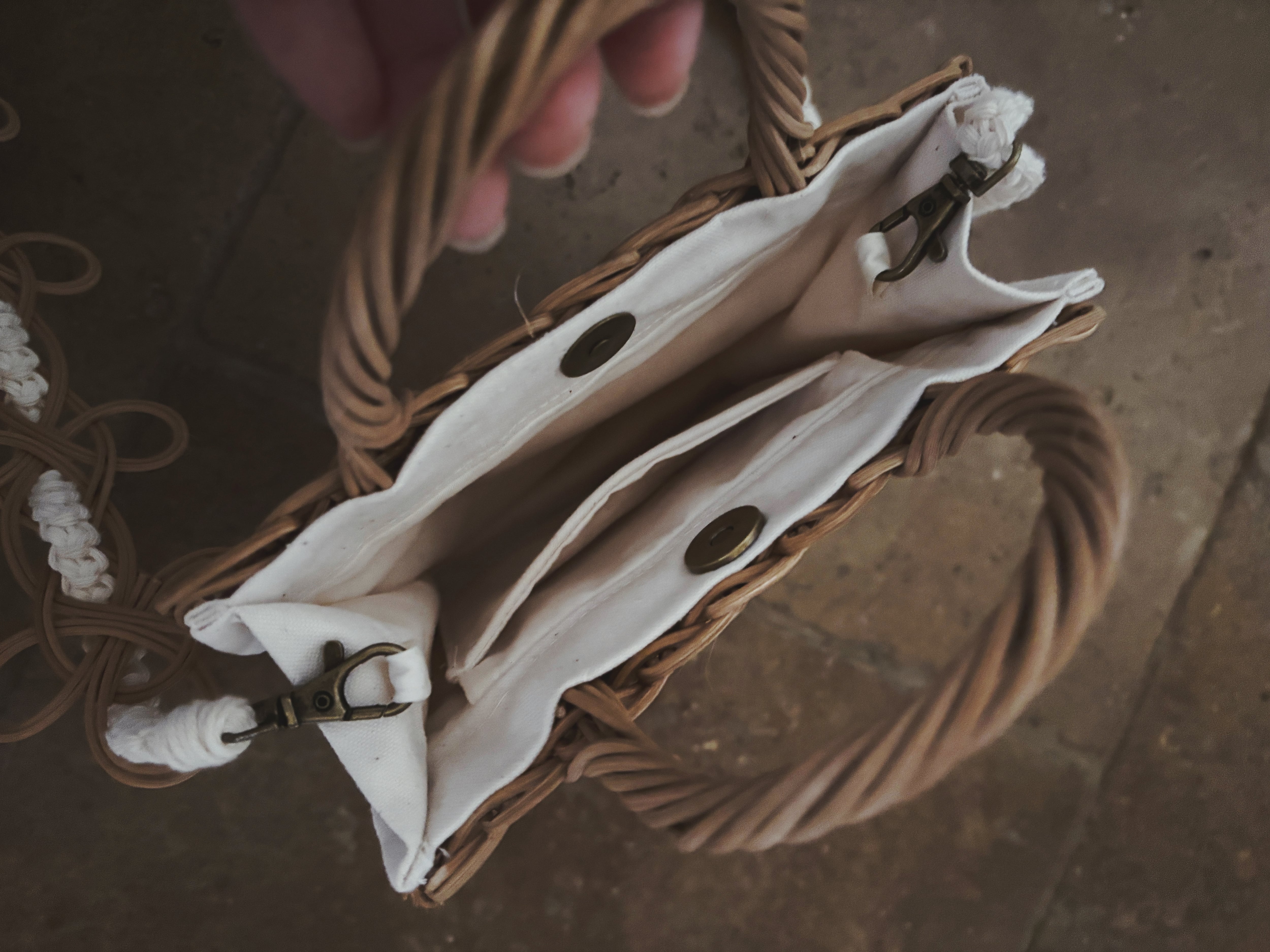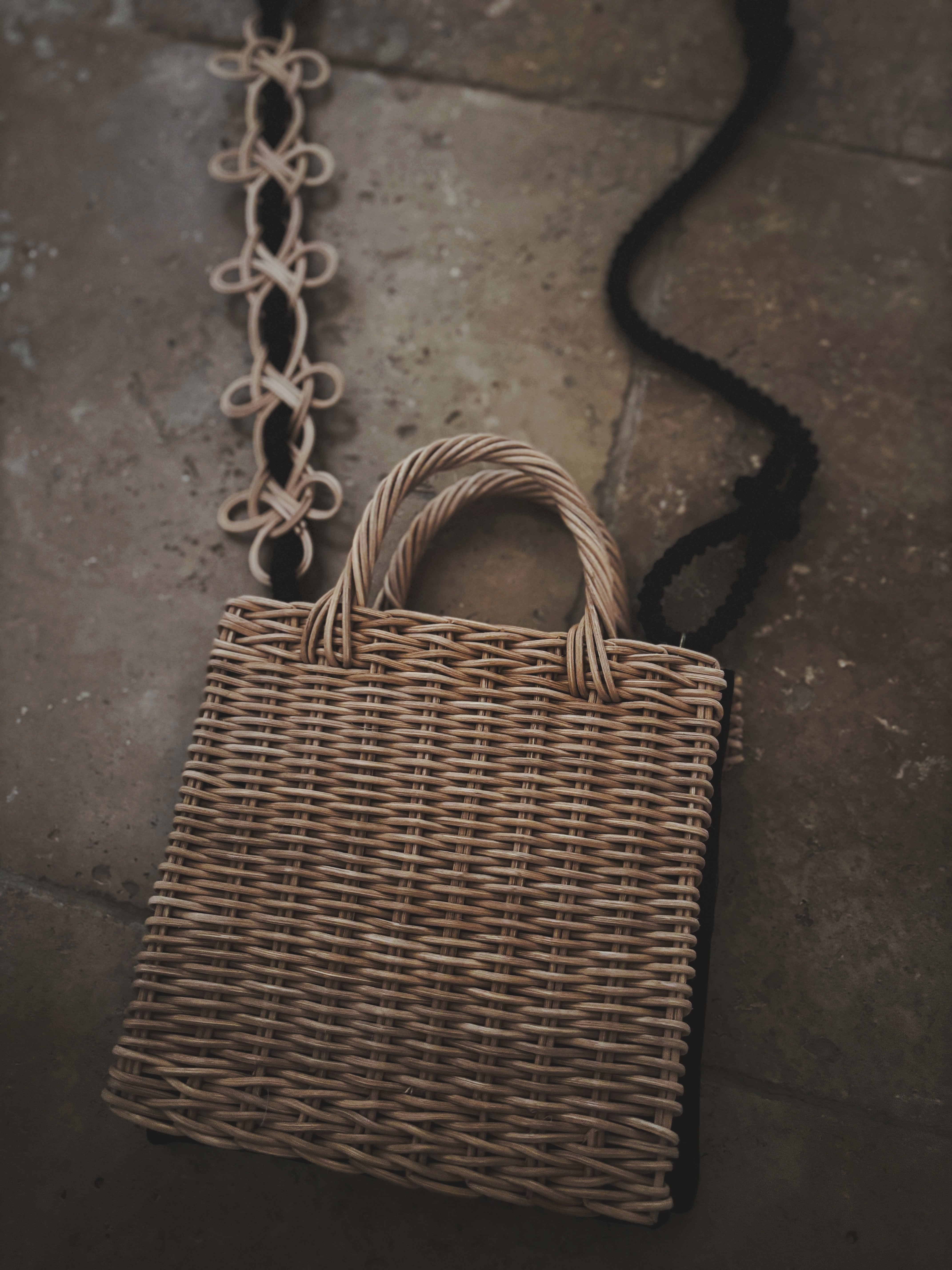 コットン糸をかぎ針で編んだストラップに籐編みのモチーフを合わせています。